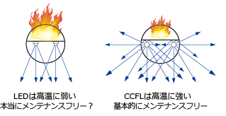 LEDは明るさに比例して発熱量が増加し、LED自身を劣化させてしまい、寿命や輝度が落ちてしまいますので放熱対策がもっとも重要になります。LEDは長寿命で10年以上もメンテナンスフリーは本当でしょうか?上部に積もりに積もった埃や汚れは放熱性を妨げて寿命短縮や明るさの劣化に繋がりかねませんか?一方、CCFLは製品温度が40℃程度と低発熱ですのでメンテナンスフリー。夏場の冷房効果のアップにも期待できます。