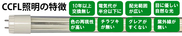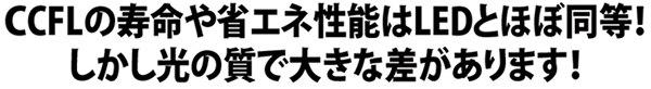LEDは直線性の強い光ですから照射物に影が強くできやすく実は視認性がよくありません。CCFLは影が自然につくため視界が良好です。室内照明は均一な配光(広がり)も大切です。
