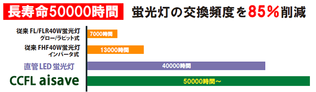 CCFL蛍光灯アイセーブの寿命はなんと50000時間。従来の一般蛍光灯に比べて6倍以上も長寿命です。しかもCCFLはLEDと比べても光衰が少なく、設置した当初の輝度に近い値を保ちます。