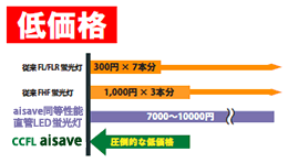 CCFLアイセーブは省エネ、長寿命で低価格です。従来の蛍光灯に掛かるランプ代や廃棄コスト、交換する人件費が削減できます。 もし従来の蛍光灯の安定器が故障した場合は安定器交換工賃だけで1台あたり15000円前後のコストが掛かりますので既存蛍光灯を使い続けるよりもだんぜん経済的です。