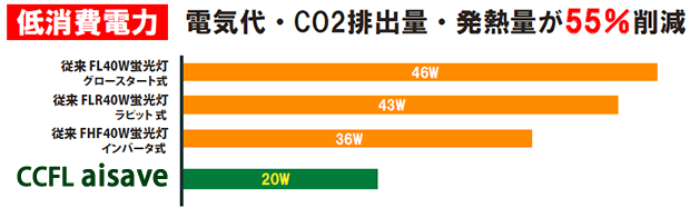 CCFL蛍光灯アイセーブ40W形は従来の一般40W形蛍光灯に比べて非常に低消費電力で、年間の電気代を55%も削減します。また他社CCFLに比べても同じ明るさでさらに25%も省エネです。